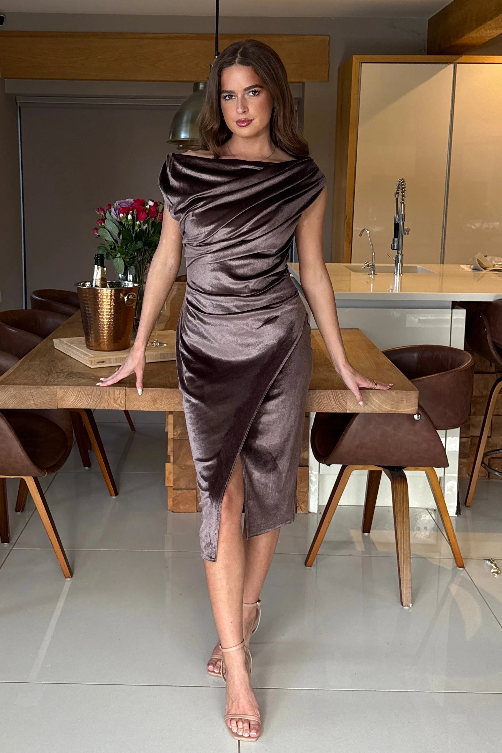 Experience the beauty and elegance of our Holly Asymmetric Midi Dress. Flattering wrap silhouette and midi length create a striking and feminine look. Made with high-quality materials, this dress offers both comfort and style. Perfect for any special occasion or a day out.
