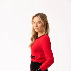 Super soft round neck fitted sweater with mock pockets, tipping detail and contrast hem and cuffs.