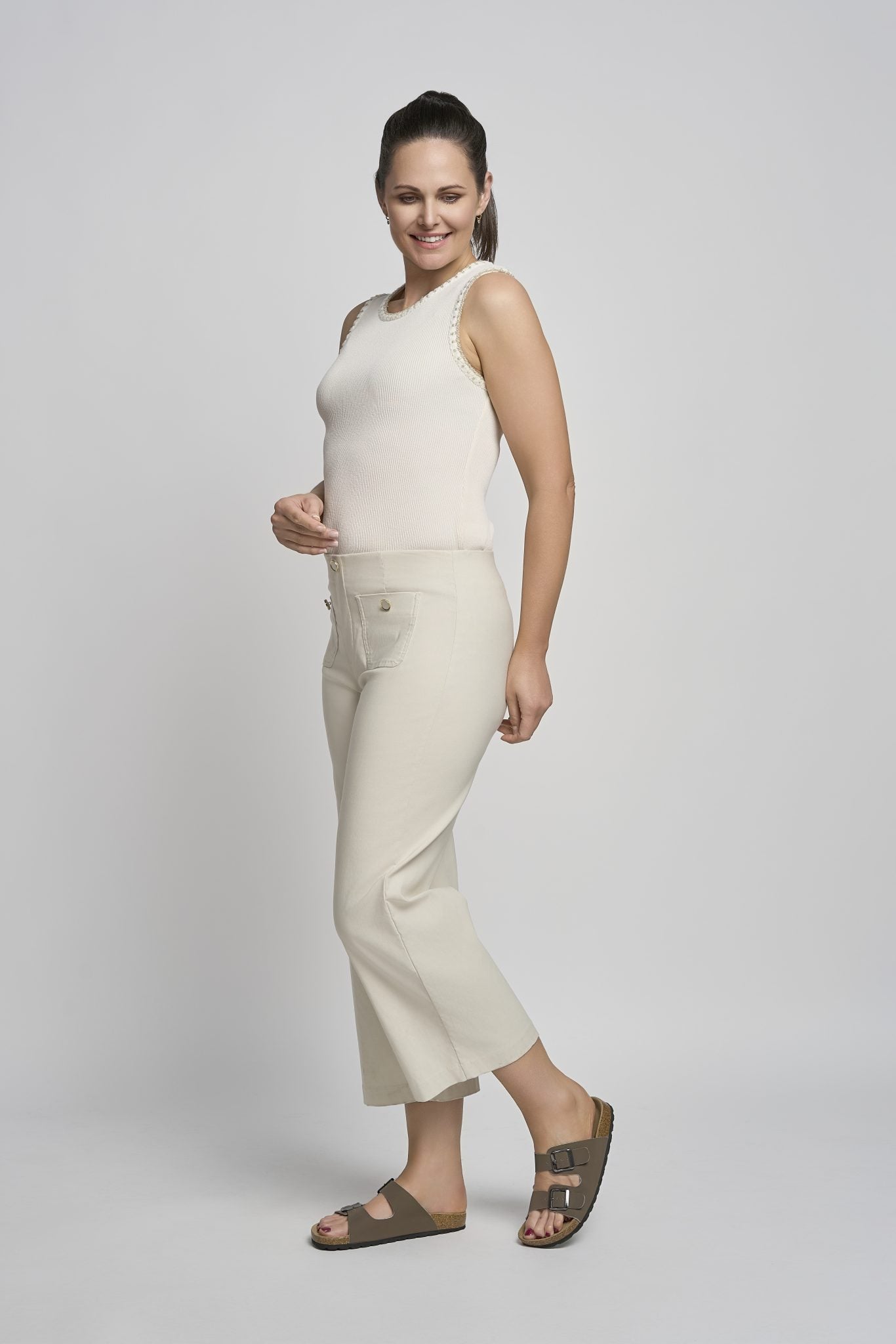 Bang on trend wide leg cropped trousers from Pinns. These gorgeous stretchy trousers with front pockets and button detail will become one of your go to items in your wardrobe this season.